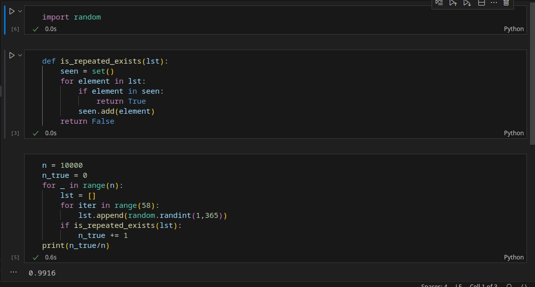 Consider a class of 58 students. What do you think is the probability that at least two people in this group share the same birthday (day and month)? If you were to make an intuitive guess, what would it be? Let’s implement this scenario together through programming! For this, we will randomly select 58 numbers from 1 to 365 and place them in a list. I will also implement a function to check whether there are any duplicate values in the list. We will repeat this process, for example, ten thousand times, and divide the number of occurrences where two values are equal (indicating two people with the same birthday) by the total number of trials (10,000). The result is astonishing! Each time you run the program, you reach a number exceeding 99 percent! Yes, it is quite surprising, but entirely possible and contrary to our intuition! The professor referred to this as the probability of relative frequency.
