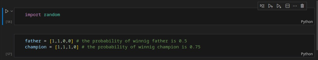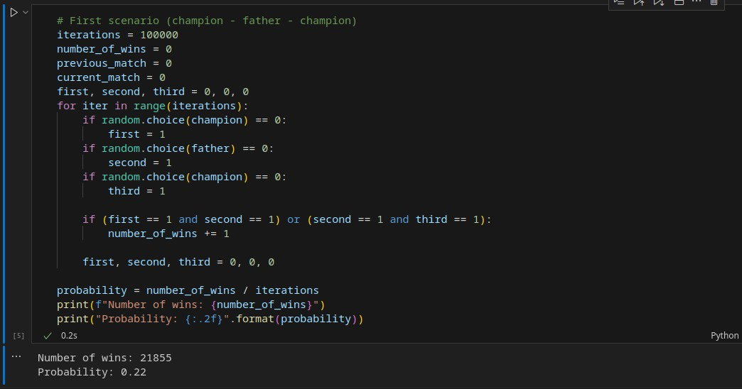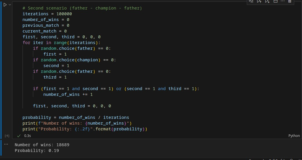 Again, I designed the scenarios through coding, assuming a 50 percent chance of the father winning against the son and a 75 percent chance of the champion winning against the son. I then implemented the scenarios for both models and repeated them a hundred thousand times; the result was again astonishing! Contrary to our intuitive expectations, the probability of the son winning two consecutive matches was actually higher in Model 1 (Champion – Father – Champion)! Although the difference was only 3 percent here, changing the winning probabilities could make the difference more significant; nevertheless, the outcome was contrary to our intuition!